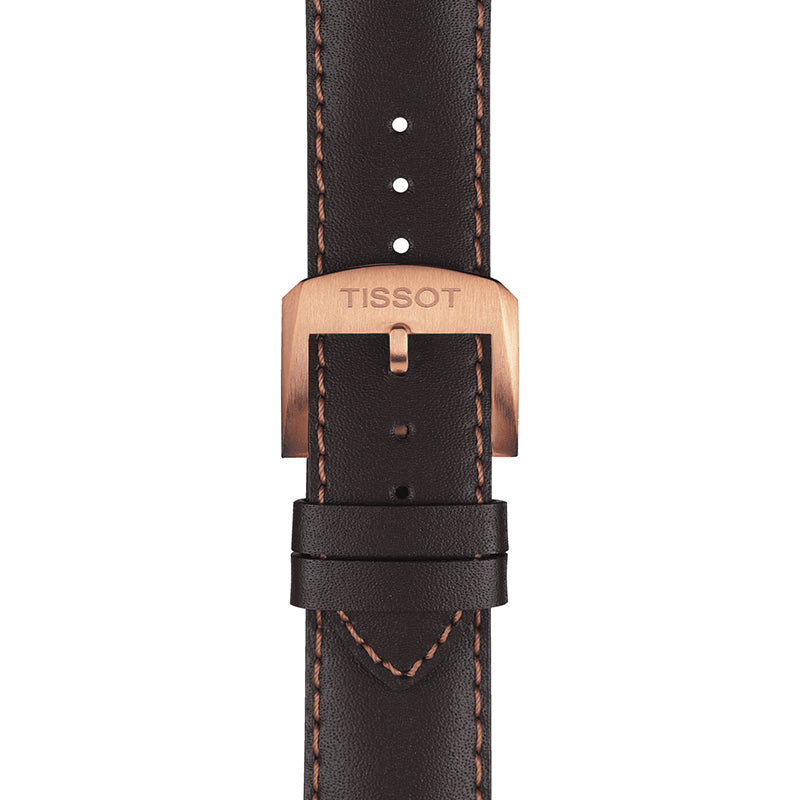 Casing baja tahan karat PVD emas mawar dengan tali kulit cokelat. Memperbaiki baja tahan karat PVD rose gold dengan cincin atas berwarna coklat yang menunjukkan bezel tanda tachymeter. Pelat jam perak dengan jarum jam berwarna emas mawar bercahaya dan penanda jam indeks. Angka Arab menandai posisi jam 12. penanda menit di sekitar tepi luar. Jenis Dial: Analog. Tangan bercahaya. Tampilan tanggal pada posisi jam 4. Kronograf - menampilkan tiga sub-dial: 60 detik, 30 menit, dan 1/10 detik. Gerakan kuarsa Kaliber ETA G10.211. Kristal safir tahan gores. Tarik / dorong mahkota. Bagian belakang casing kokoh. Bentuk case bulat, ukuran case: 42 mm, ketebalan case: 10.72 mm. Lebar pita: 19 mm. Gesper tang. Tahan air pada 100 meter / 330 kaki. Fungsi: kronograf, tanggal, jam, menit, detik, tachymeter. Gaya jam tangan olahraga. Label jam tangan: Buatan Swiss. Variasi Barang : T095 417 36 037 01, T095-417-36-037-01, T095/417/36/037/01, T0954173603701. Tissot Quickster Chronograph perak panggil Unisex Watch T095.417.36.037.01.